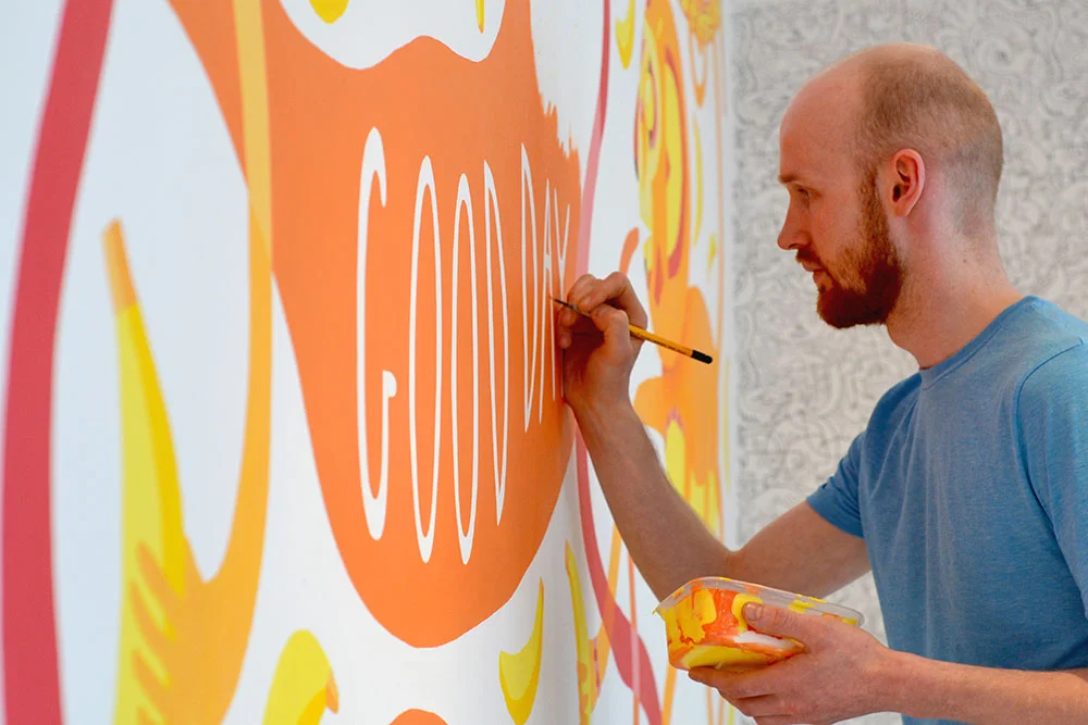 LIFE, in Birmingham, invited me to paint a large mural in their front meeting room. The brief: to illustrate and include the phrase “Today is a good day”.