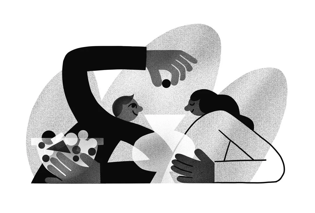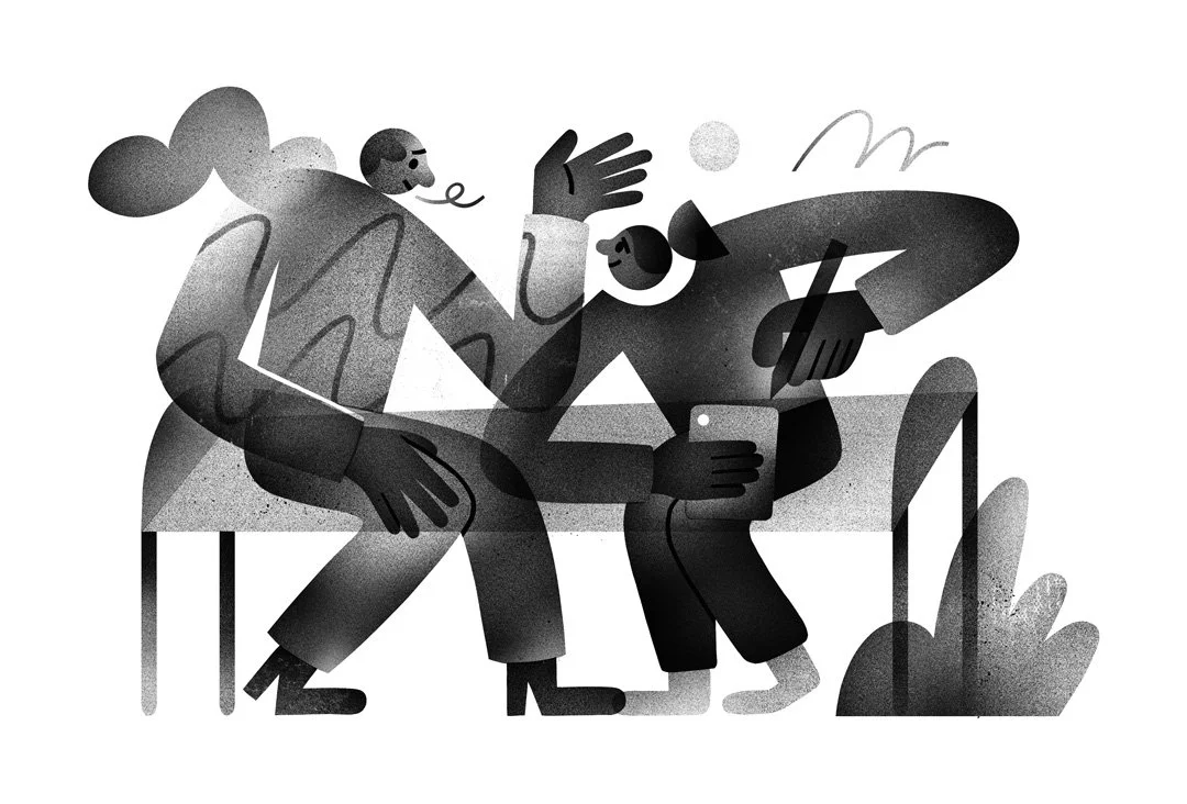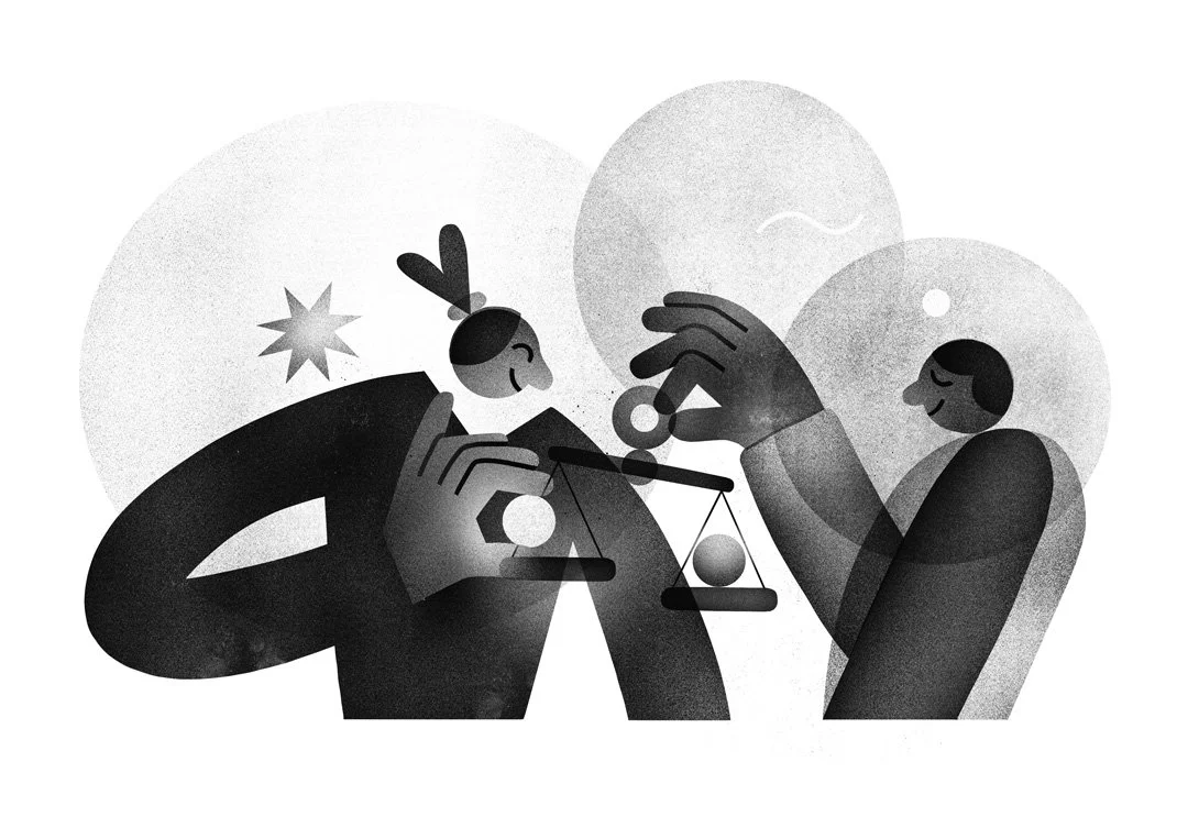 A series of black & white spot illustrations each one dealing with different aspects of therapy or environments where problem solving can take place. Each greyscale artwork shows two people working together. In the a cafe, with a plant between them, one talks, while the other listens, taking notes. In the park, you have the same relationship of talker and listener. Another illustration shows an empty container either about to be filled with different shapes, or perhaps the container has just been emptied of shapes - possibly symbolising problems. And, in the final illustration, below, you have a balancing of scales.