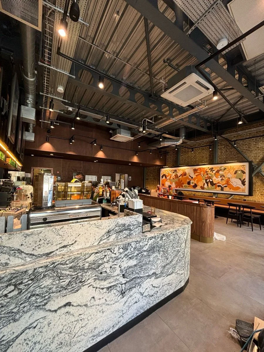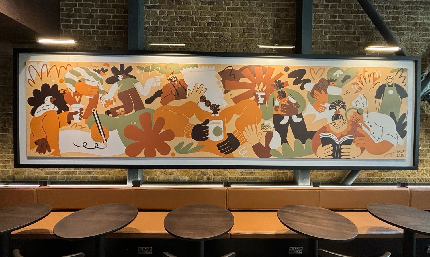 An elongated landscape artwork with themes of community and connection over coffee. A group of cheerful characters overlap each other, some holding hands, leaning on each other or hugging. Cups are clasped, a father carries a baby, words are written, books read and music listened to with content smiles on faces. Other characters are involved in the roasting (carrying sacks of coffee beans) or waving a greeting to you.